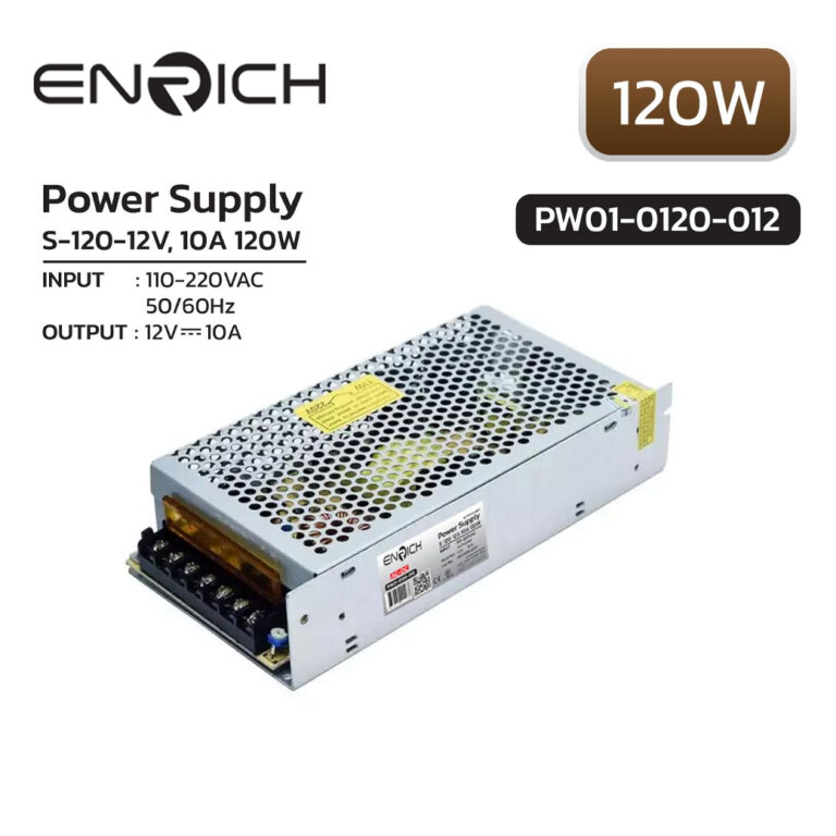 พาวเวอร์ซัพพลาย ENRICH S-120-12V 10A 120W ใช้สำหรับแปลงกระแสไฟฟ้าจากกระแสสลับ AC เป็นกระแสตรง DC สามารถใช้กันอุปกรณ์อิเล็กทรอนิกส์ได้หลากหลายชนิด ในการติดตั้งควรเลือกใช้สายไฟกระแสสลับที่มีสายดิน เพื่อความปลอดภัยมากขึ้นขันสกรูติดกับสายไฟให้แน่น เพื่อไม่ให้เกิดการสปาร์ค และเพื่อไม่ให้สายไฟหลุด เนื่องจาก Body ของ Power Supply เป็นโครงโลหะ (แต่มีฉนวนกั้นไว้แล้ว) แต่เพื่อความปลอดภัยควรนำเครื่อง Power Supply ติดตั้งบนฉนวนหนาๆ ก่อนการใช้งานจริง ระบายความร้อนได้ดี ทนทาน มีการรับประกันสินค้า 1 ปีเต็ม ได้รับมาตรฐาน มอก.1955-2551